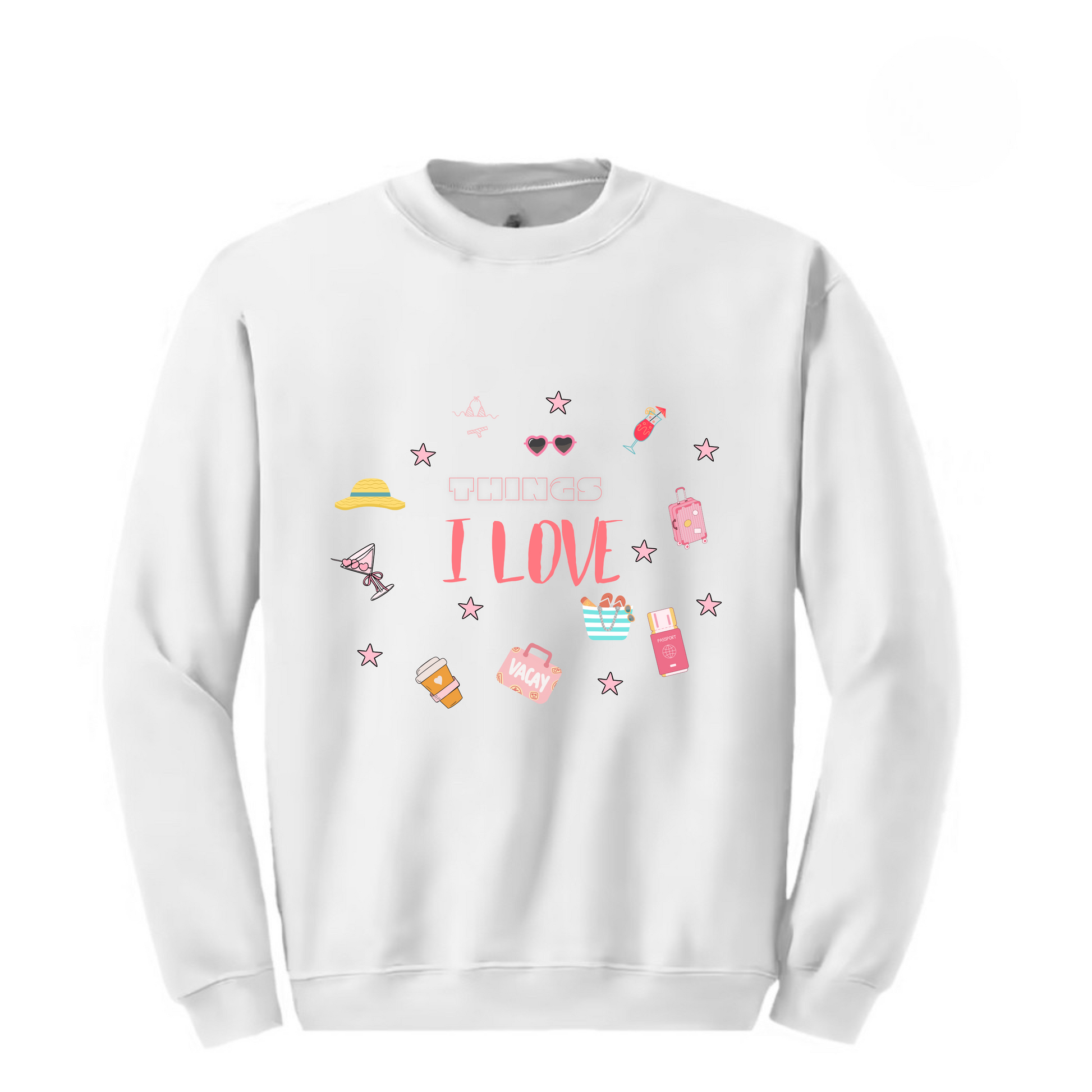 Introducing our new Crewneck Sweatshirt, perfect for any casual occasion. Made from high-quality material, it provides both style and comfort. With its trendy "Things I love" design, it's a great way to show off your interests while staying warm. Upgrade your wardrobe with our Crewneck Sweatshirt.